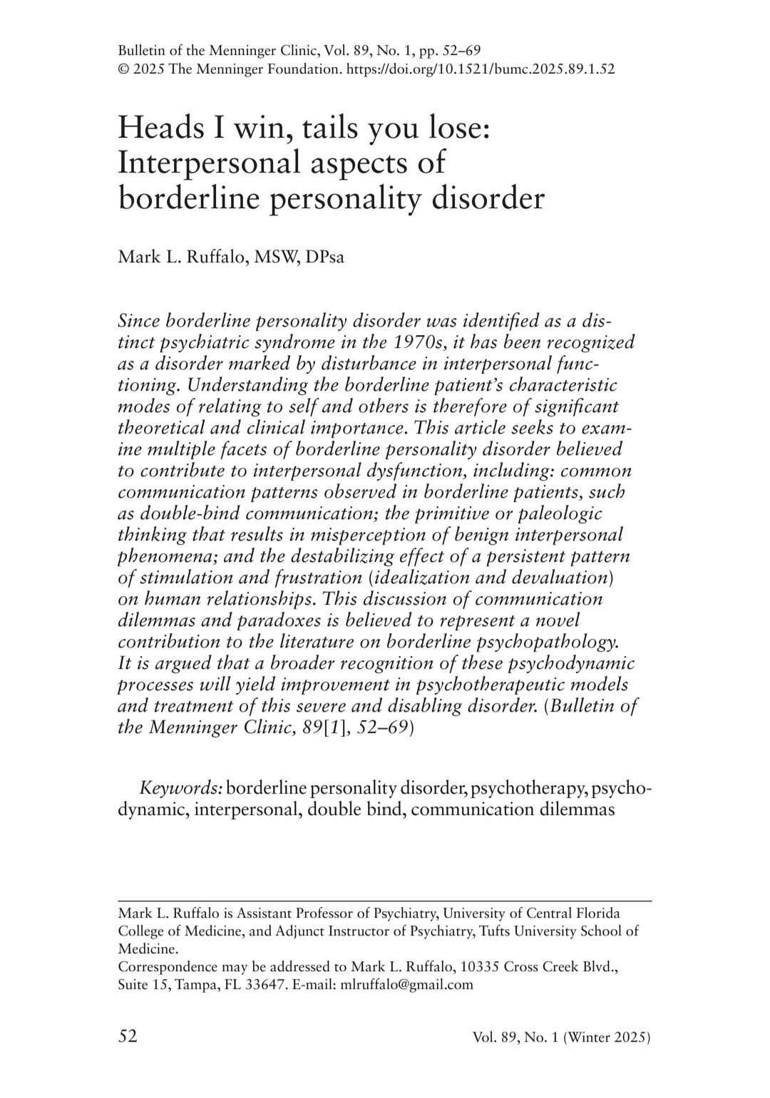 In March 2025, the Bulletin of the Menninger Clinic published my paper, "Heads I Win, Tails You Lose: Interpersonal Aspects of Borderline Personality Disorder," which, to the best of my knowledge, represents the first peer-reviewed paper applying the double bind theory specifically to BPD. This followed my February 2024 article in Psychiatric Times, "Double Binds in Borderline Communication," later featured on the cover of the May 2024 print edition.